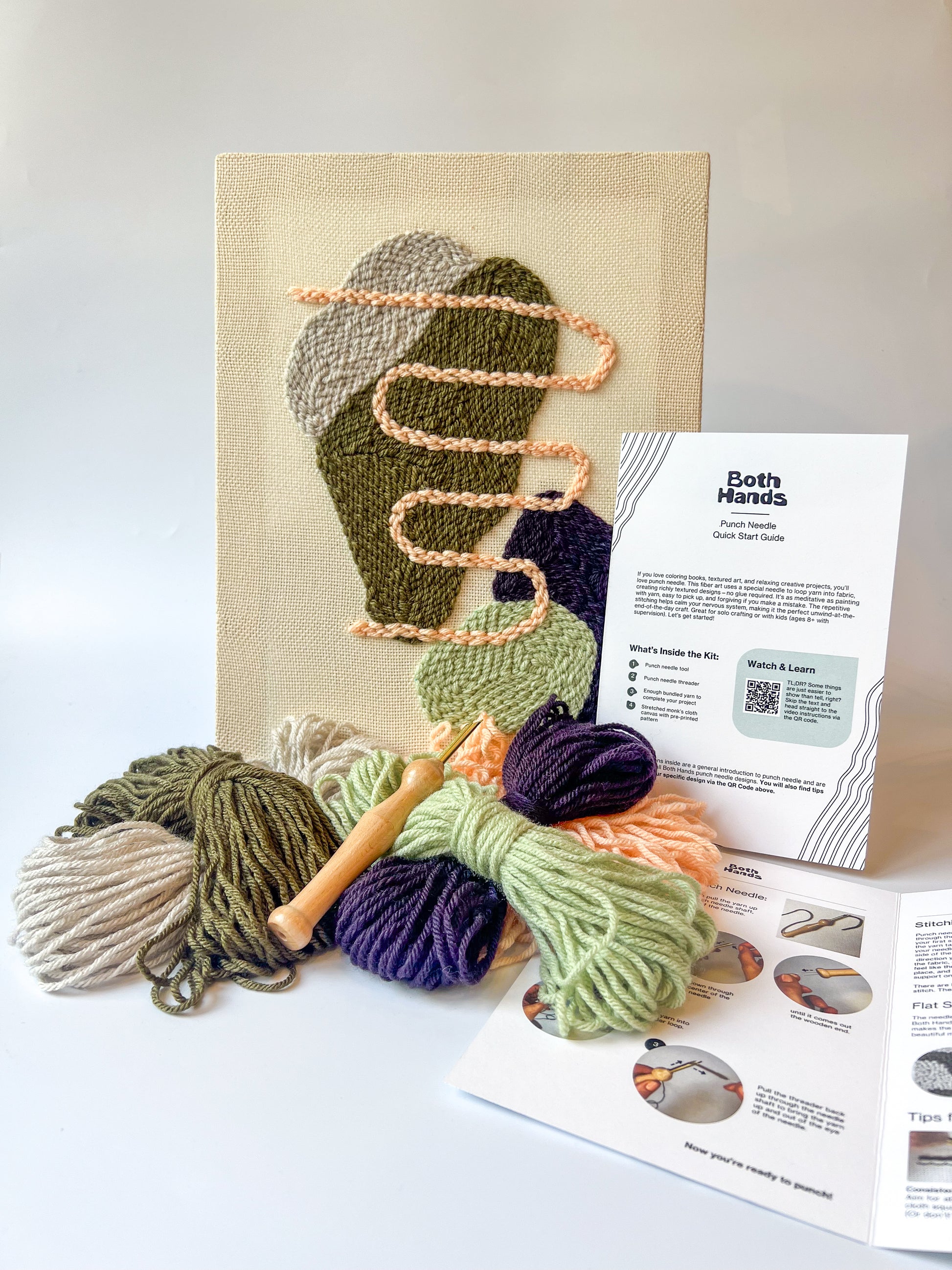 Both Hands kits come with everything you need to make unique, textured wall art in an evening or weekend—no prior punch needle experience needed. This beginner-friendly design comes with quality materials and easy to follow instructions. You'll punch the design directly onto a stretched monk's cloth canvas, so when you're done, it's ready to display.